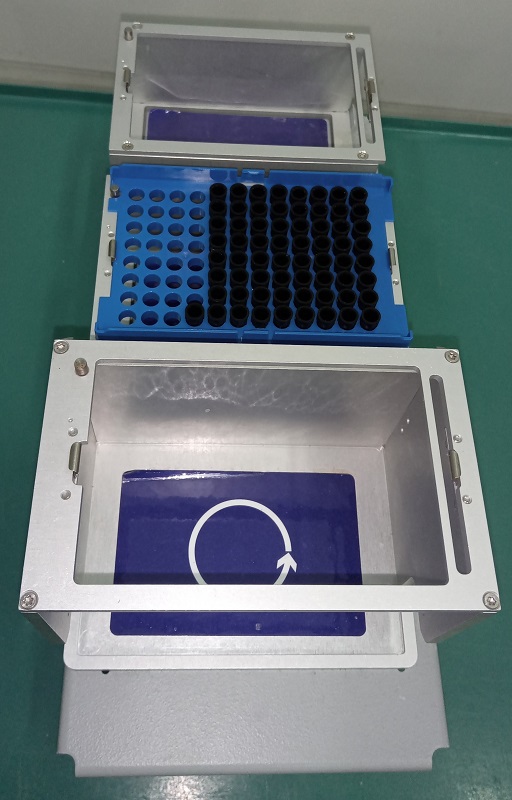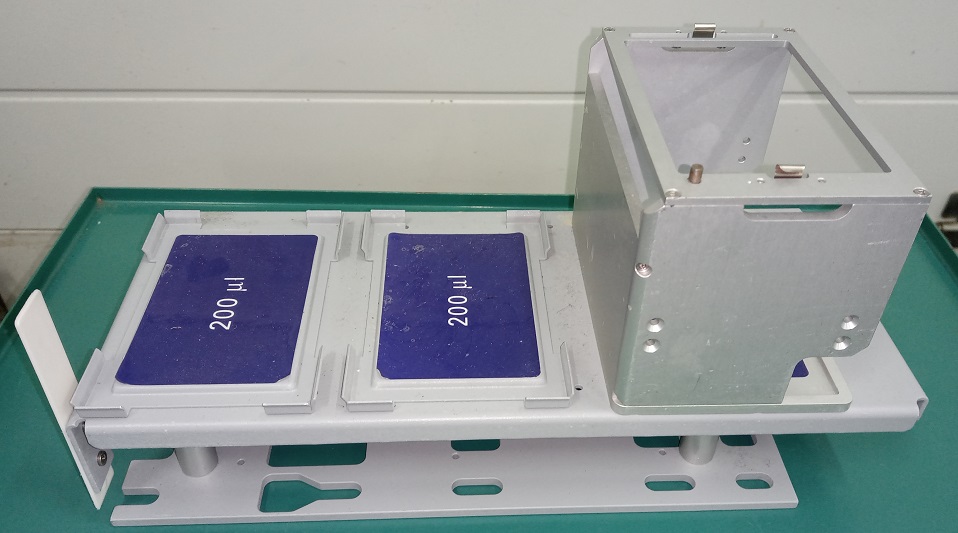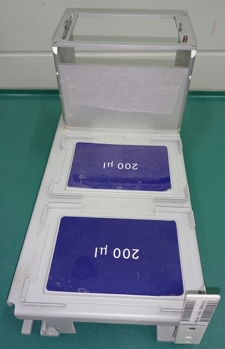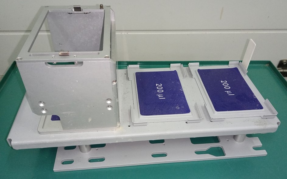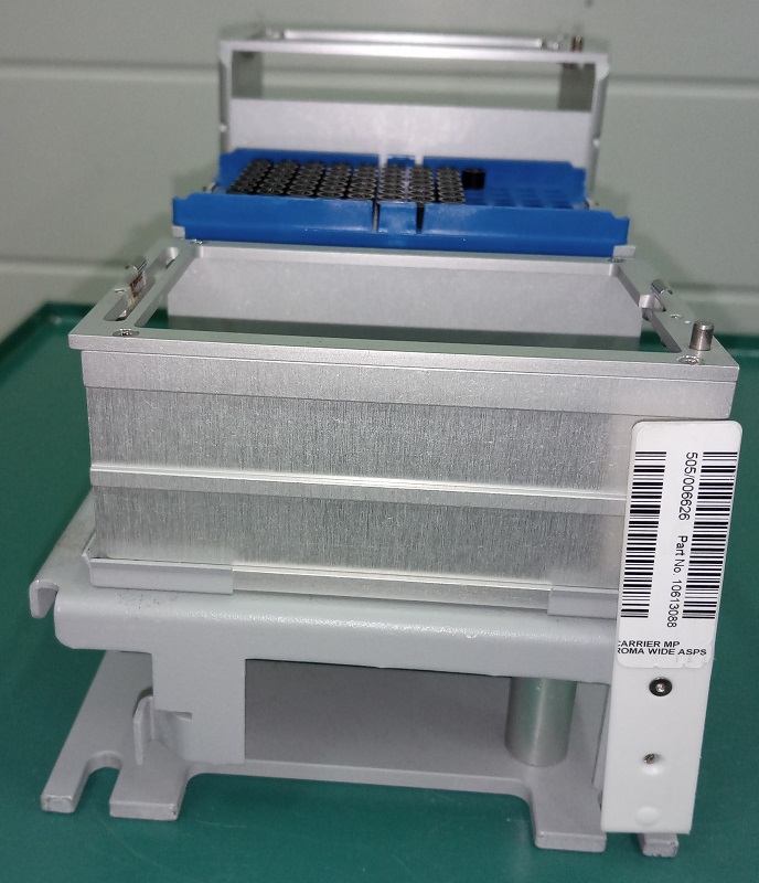 DiTi 200 rekhouder (Abbott 04J72-30), afkomstig van het Abbott m2000sp robotsysteem. Voor wegwerppipetpunten van 200 µl. Inclusief één vast en twee beweegbare rekken.