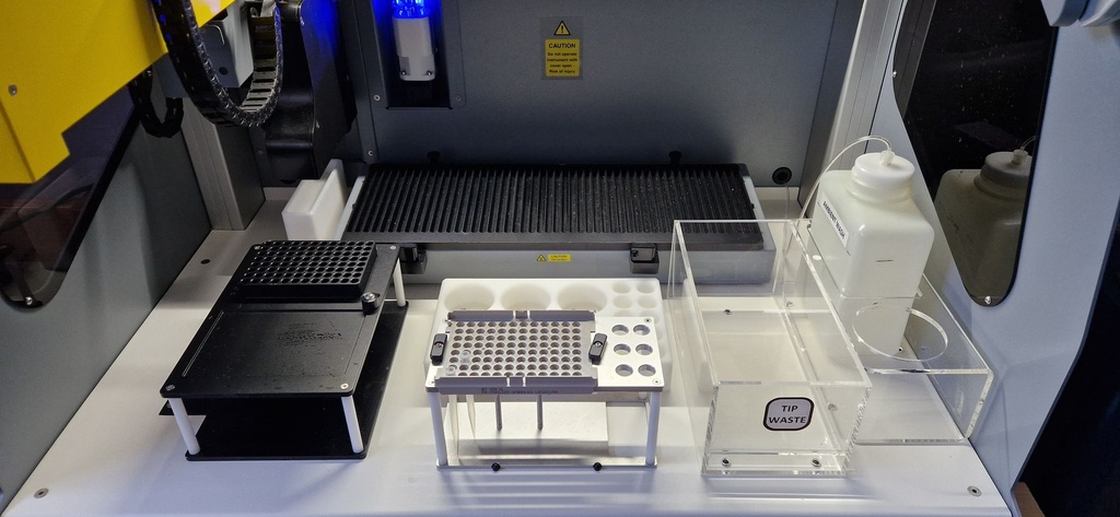 Deze roboblot heeft een speciale setup die het mogelijk maakt 96 wells of 96 well tubes te gebruiken. Deze Roboblot heeft dus niet de standaard setup met carrousel.