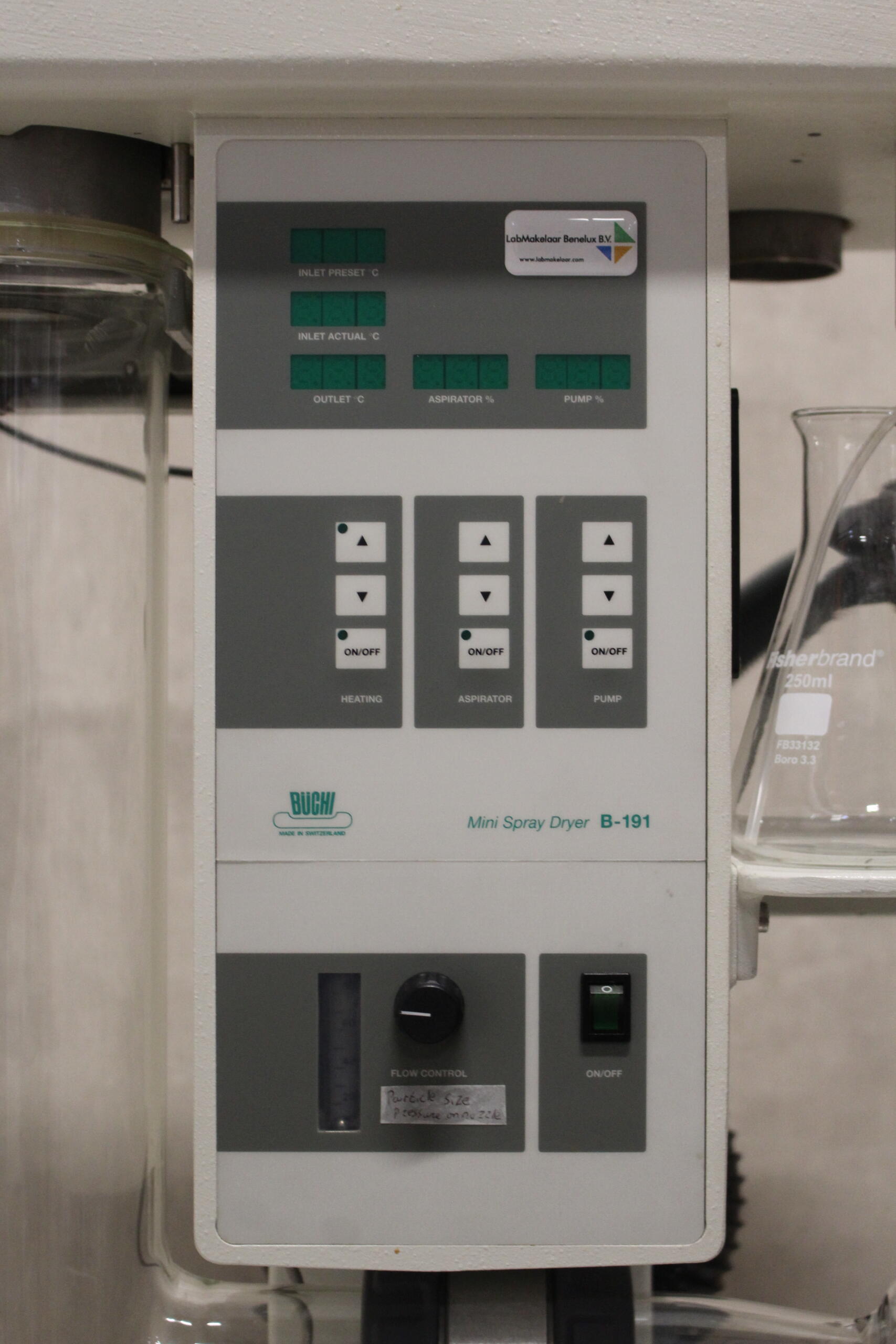 De Mini Spray Dryer B-191 werkt volgens het parallelstroomprincipe. Dit betekent dat het gespoten product en de drooglucht in dezelfde richting stromen.