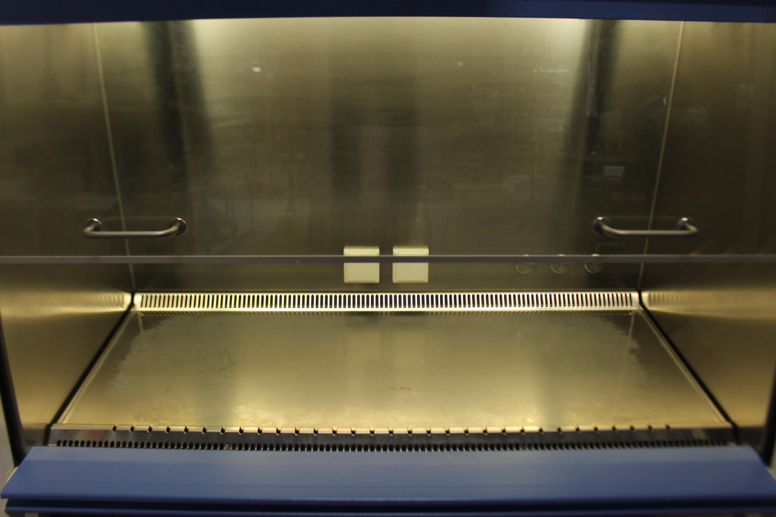 Via de werkopening wordt lucht de werkruimte ingezogen, richting de voorste sleuven van het werkblad. Dit beschermt het personeel tegen mogelijk vrijkomende pathogene aerosolen.