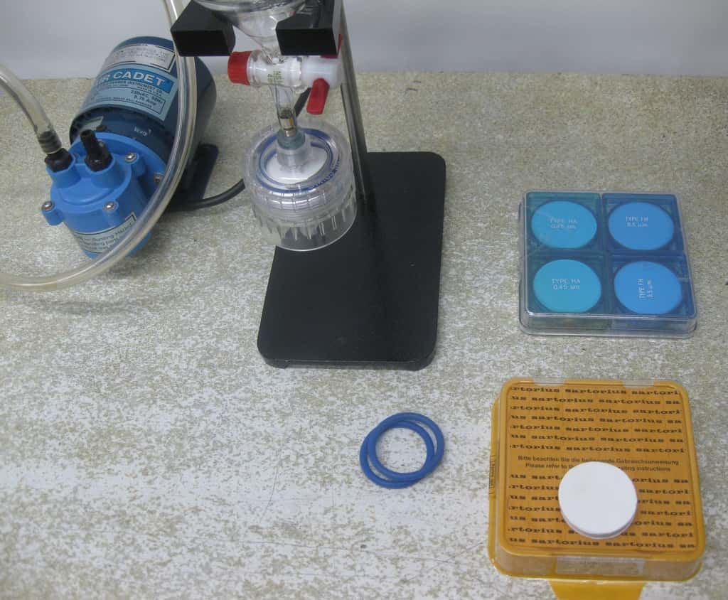 Een komplete filterset, bestaande uit een membraan druk/zuig pompje van Cole-Parmer en een 800 ml glazen drukvat met een “luer-lock” filter aansluiting. Bijgeleverd worden verschillende Millipore (HF/HP) filters en Sartorius Cellulose acetaat filters.