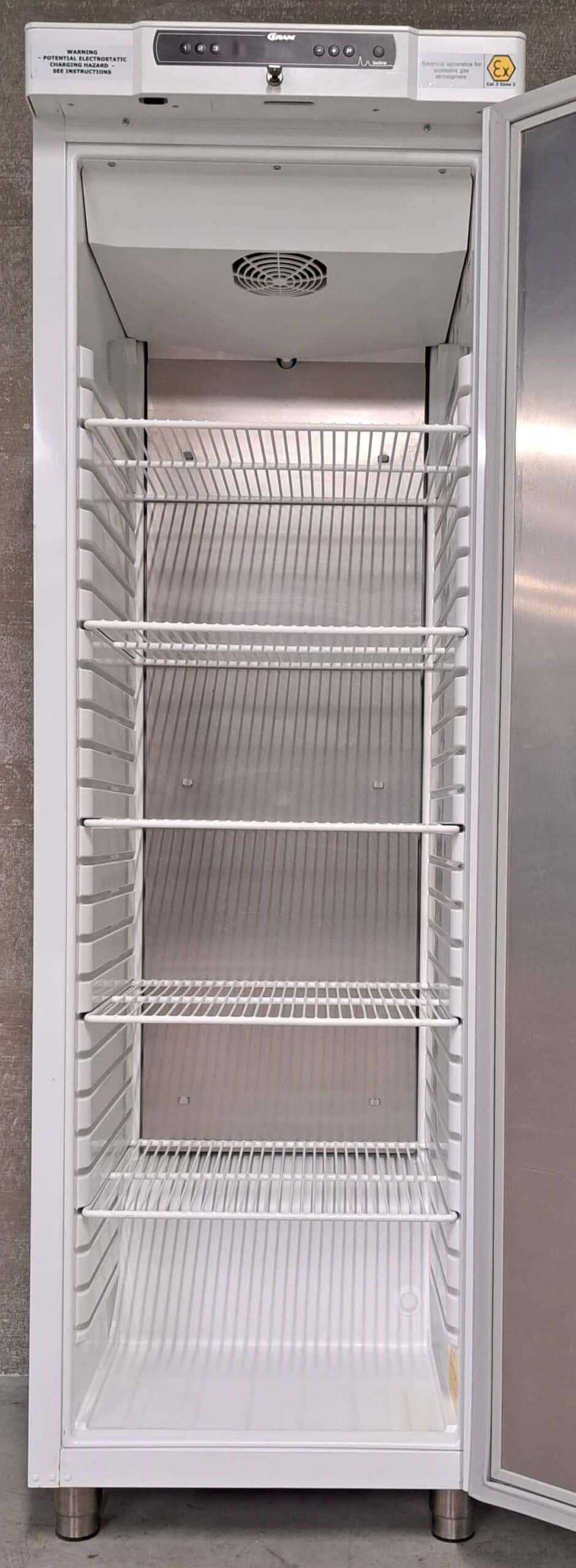 De occasion Gram BioCompact II RF410 is een hoge laboratorium vriezer met 5 gecoate draadroosters.