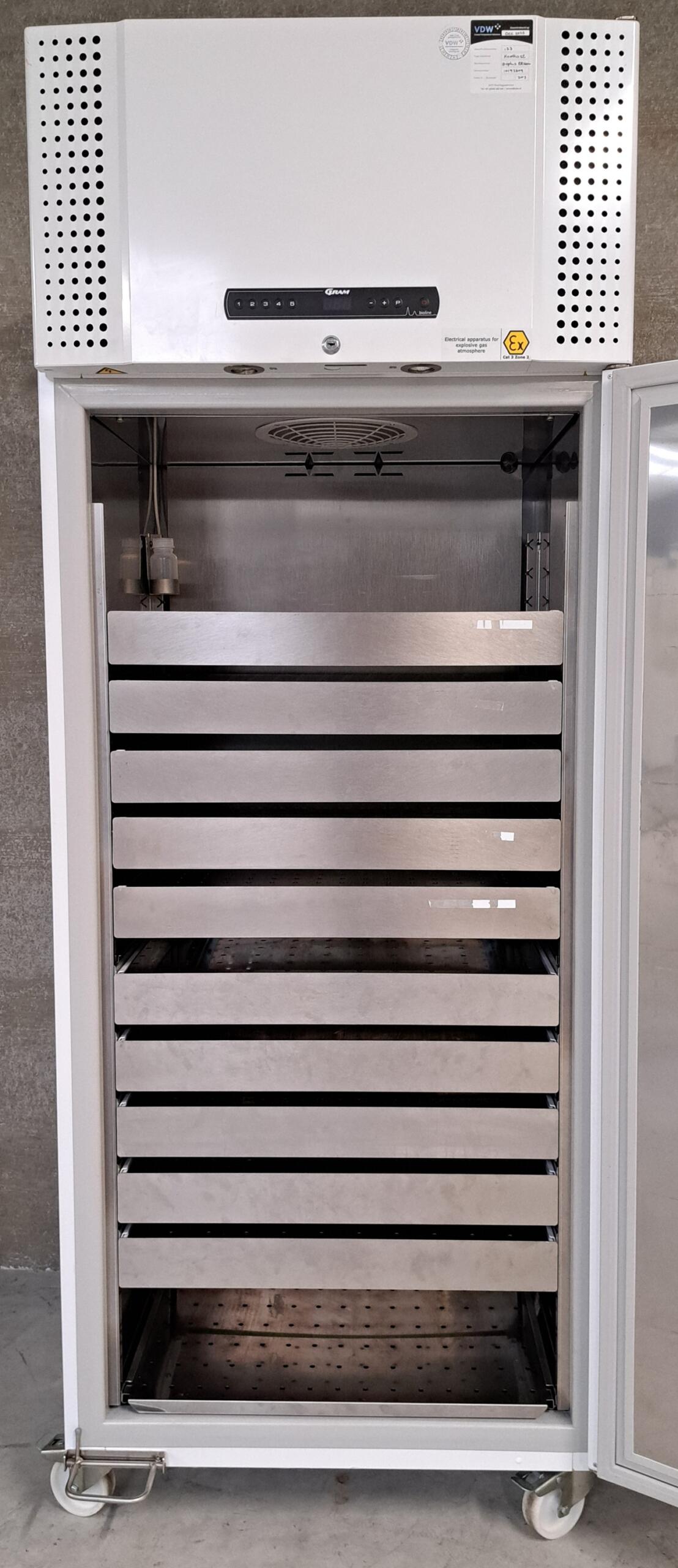 De Gram BioPlus ER660W is een brede laboratorium koelkast met een ruime opslagcapaciteit. De lab koeler heeft een wit gecoate buitenzijde en RVS binnenzijde en is voorzien van wielen en een voetpedaalopener. De binnenruimte is uitgevoerd met 5 grote RVS lades en een RVS geperforeerd plateau.