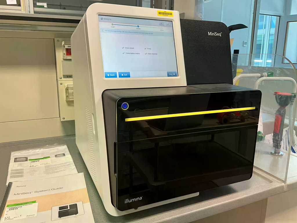MiniSeq van Illumina (gebouwd in 2016). Next-generation sequencing (NGS)-technologie. Geïntegreerd systeem voor de geautomatiseerde generatie van klonale DNA-clusters door middel van amplificatie, sequencing en data-analyse.