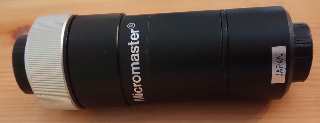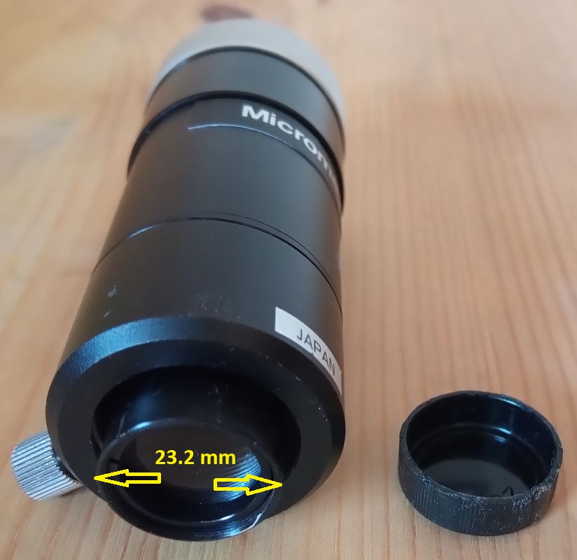 Micromaster camera-adapterbuis voor microscoop. Lengte circa 12,6 cm. Buitendiameter van het schroefdraadeinde: 25,2 mm. Buitendiameter van het microscoopuiteinde: 23,2 mm.